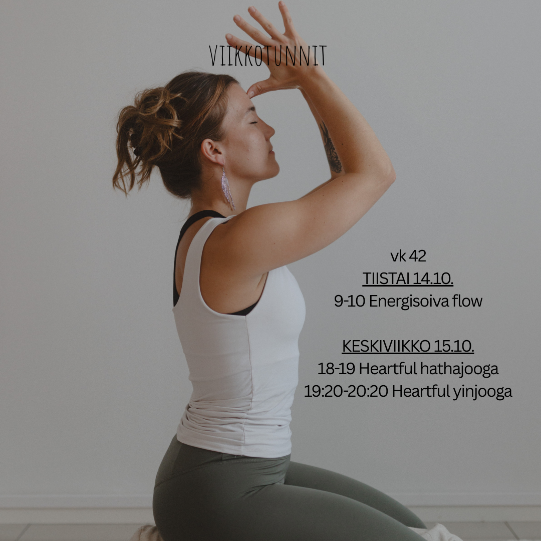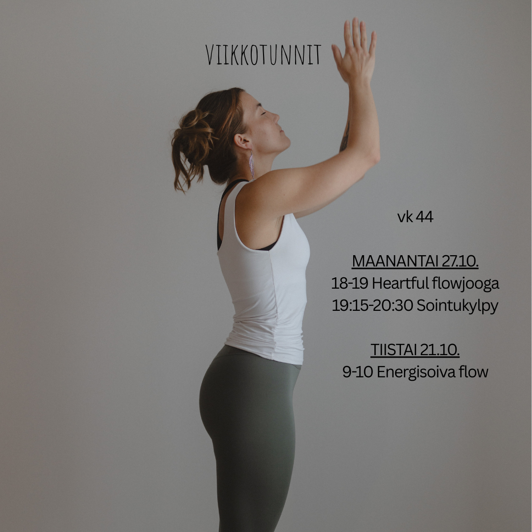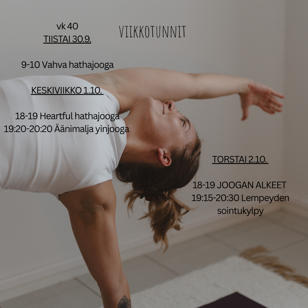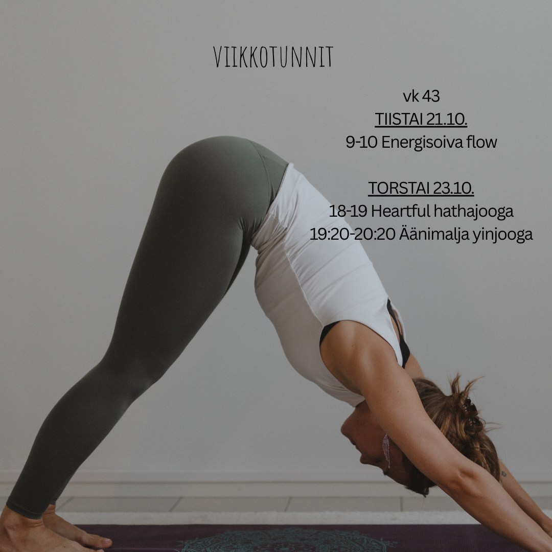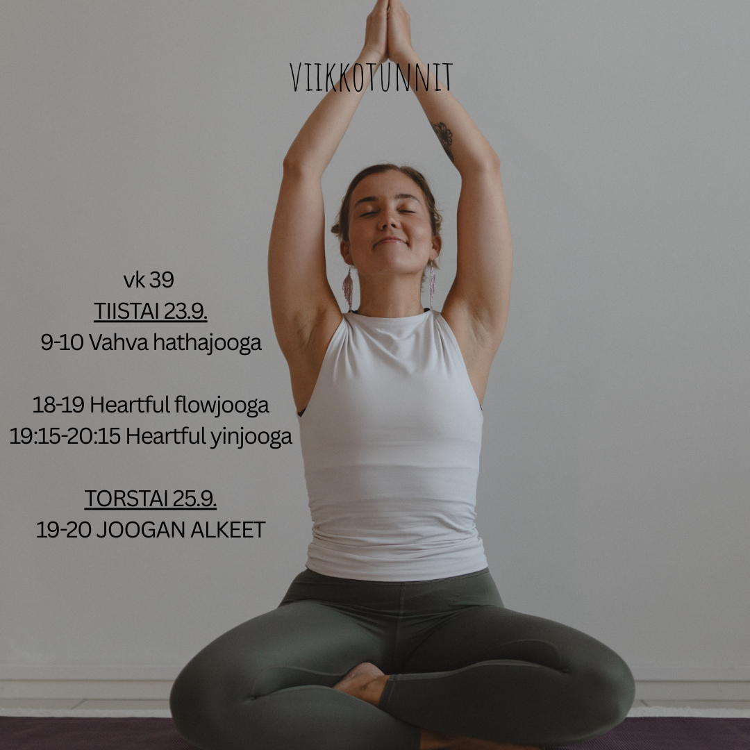 Jogatunneille mukaan joogaan sopivat vaatteet, vesipullo ja oma joogamatto. Yinjoogaan ja sointukylpyihin ota mukaasi lämmintä vaatetta ja villasukat. Tuntien tahti on hidasta, ollaan vain ja rentoudutaan. Jos sinulta ei löydy omaa joogamattoa, voi studiolta lainata. Muut joogatarvikkeet peitot, tyynyt, bolsterit, tiilet ja vyöt löytyvät studiolta.