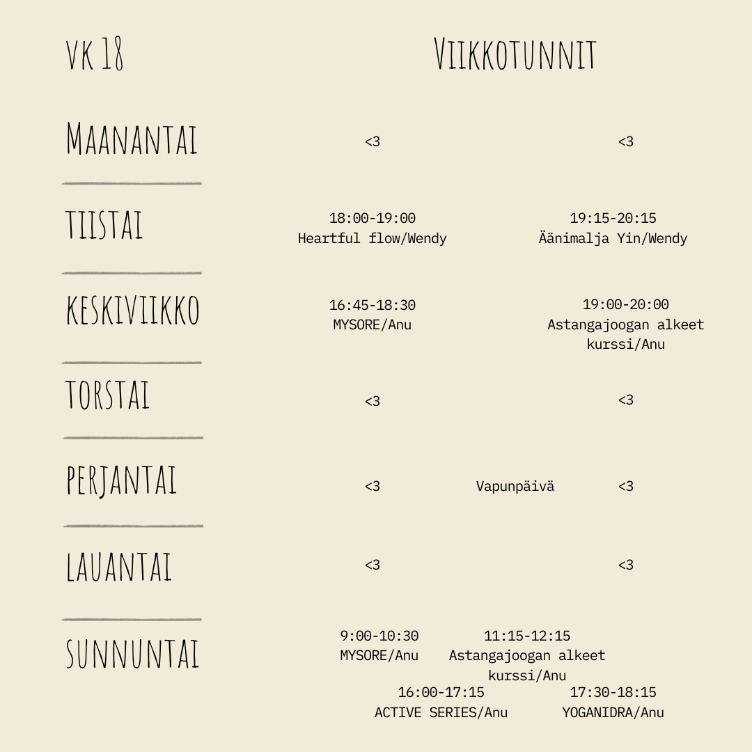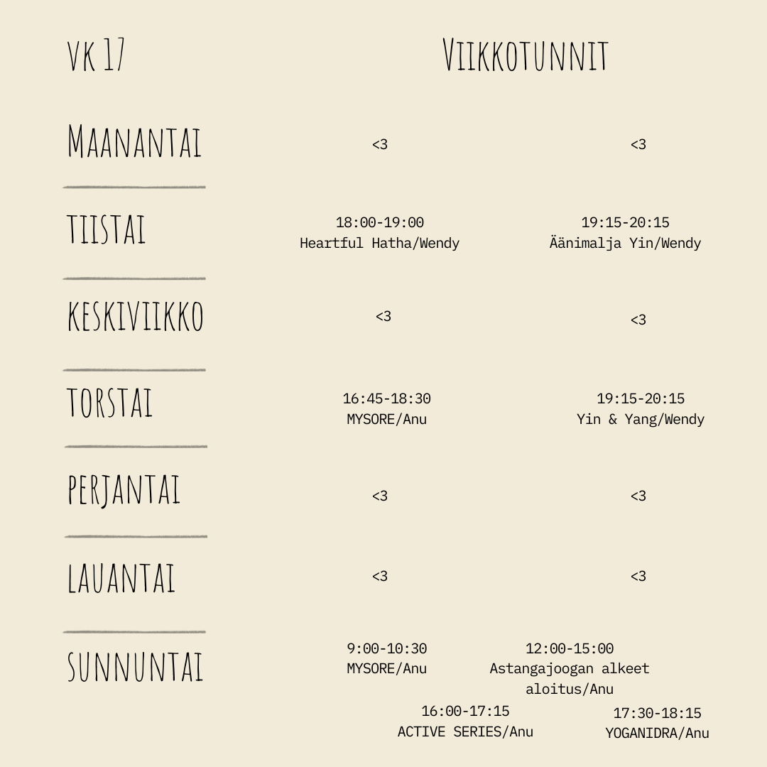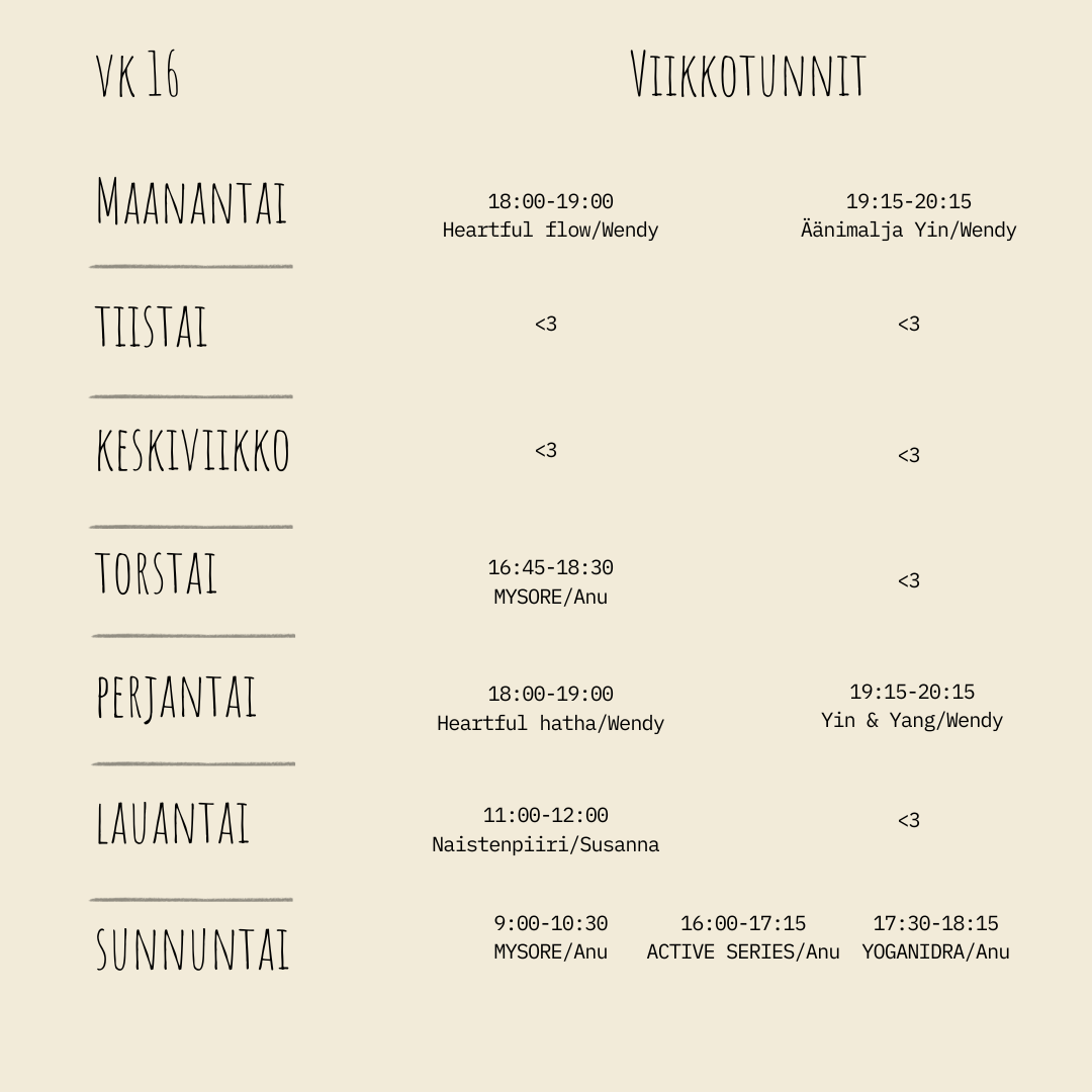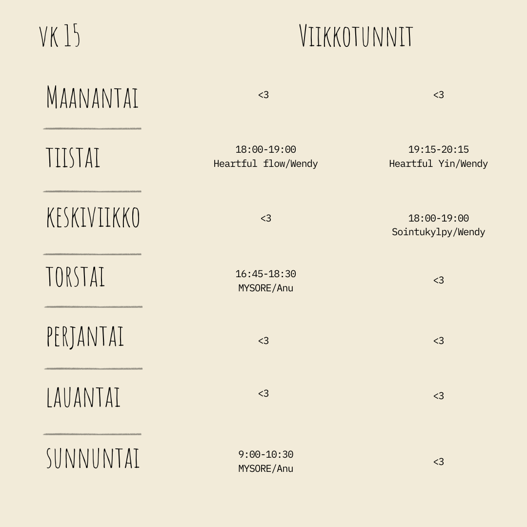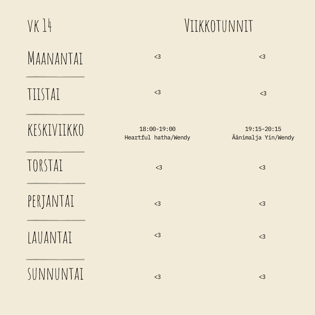 Wendy ohjaa Studio Laventelissa viikkotunteja vaihtuvin teemoin. Tunneista löytyy lisää infoa instagramin ja facebookin kautta. Ilmoittautuminen tunneille toistaiseksi viestillä.